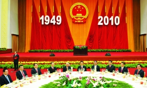 今晚的人民大会堂宴会厅张灯结彩,鲜花吐艳,洋溢着喜庆热烈的气氛。主席台上方国徽高悬,10面鲜艳的红旗分立两侧,“1949-2010”的大字年号熠熠生辉。