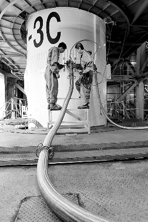 记者与发射场技术人员通电话时了解到,西昌卫星发射场当日已经是完全封闭的状态,2号发射塔下有一辆消防车待命,附近还增设了哨卡。上午9时,工作人员开始为长三丙火箭加注常规燃料, 火箭燃料分为常规推进剂和低温推进剂两种。据西昌卫星发射中心测发总体室主任符菊梅介绍,当日进行的是为火箭一、二级和助推器加注常规推进剂,并已顺利完成。由于火箭第三级使用的是质量更轻、能量更高的低温推进剂,这部分燃料的加注要到发射前8个小时才开始。按照发射指挥部的工作计划,10月1日上午10时许,活动塔“脚下”的64只滑轮将托着活动塔缓缓平移,约40分钟后将活动塔移动到150米开外。约在上午11时30分,工作人员将会给长三丙火箭加注低温燃料。