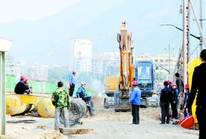 当日下午3时许,记者赶到南山路西北民大段看到,施工单位兰州市政公司已将战备路多半幅马路进行了封闭施工,西北民大后门以西仅允许单幅通车,施工单位正在沿西北民大围墙外侧进行基坑钻探。在西北民大后门以西至五泉天桥段,民大隧道的入口工程也全面展开,一辆挖掘机和数台掘井机正在忙碌着。