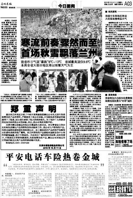 记者随后了解到,10月10日凌晨,兰州市降水5.5毫米,同时也带来了一股强劲的冷空气,使得气温跌至5.1℃至9.8℃,比前一日最高温度下降10℃左右。同时,9日14时至10日14时,我省陇东南出现了中雨,部分地方出现了大雨,雨量基本在16到45毫米;甘南、临夏、定西出现了中雨,雨量基本在11到24毫米;兰州、白银两市出现了小雨,雨量基本在4到9毫米;河西五市大部分地方出现了零星小雨, 雨量基本在微量到3毫米。另外,甘南、临夏、定西、武威的部分地方还出现了雨夹雪或雪。全省最高气温整体比前一日下降8℃至13℃。