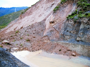 10月10日凌晨2时许,舟曲境内连降大雨,造成313省道69公里处部分山体滑坡。当日上午8时30分,记者在现场看到,有4000多立方米的泥沙淤积在路面上,数十辆过往车辆被堵,工程车正在紧张疏通。有司机向记者反映,该路段10月9日就发生过山体滑坡,道路刚刚清理开,又发生了二次滑坡。