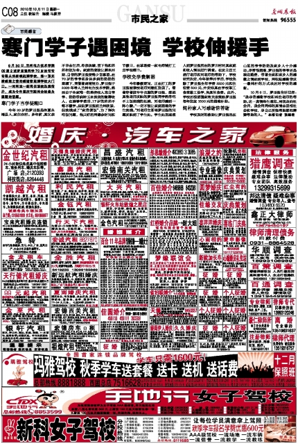 客户热线:0931-96555 传真:0931-8159628(新闻) 8123740(广告) 本报社址:兰州市白银路123号 邮编730030 Email:lzcbreader@163.com