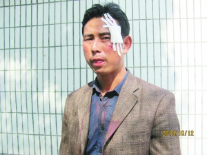 随后,记者在赵平午的工友杨军平的指引下前往事发地点时,在医院门口遇到另外一名伤者王东,王东的额头左侧贴着纱布,西服上残留着斑斑血迹。据他讲,他的头部缝合了7针。