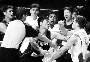 本报讯10月12日,中国男篮和巴西队的第三场热身赛在许昌展开,比赛开始仅1分钟,张庆鹏被对方打伤后脑,表示抗议的中国队主帅邓华德随即就被驱逐出场,随后两队爆发了大规模冲突。冲突过后,退回更衣室的巴西队拒绝比赛。此后主办方宣布,比赛改为中国队的队内教学赛。