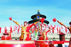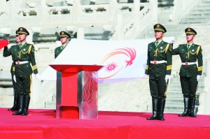 10月的北京秋高气爽,天坛公园内的祈年殿在蓝天映衬下格外金碧辉煌。12日一早,为迎接1个月后将在广州市开幕的第16届亚洲运动会,人们喜气洋洋地聚集到祈年殿南广场,参加亚运会火炬点燃暨火炬传递活动启动仪式。仪式前的演出热情奔放,由中华人民共和国国旗、亚奥理事会会旗、广州亚运会会旗以及亚洲45个国家和地区奥委会的旗帜组成的旗阵气势宏大,16面火红色的南粤大鼓豪迈激越,身着亚洲各民族亮丽服装的演员们纵情歌舞,烘托出亚洲人民期盼亚运盛会的热烈气氛。