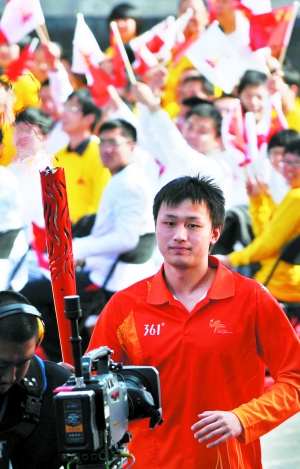 我国著名游泳运动员张琳手持胡锦涛主席授予的火炬,在圣火护卫人员陪同下,作为第一棒火炬手精神抖擞地跑出祈年门,开始了第16届亚运会火炬传递之旅。