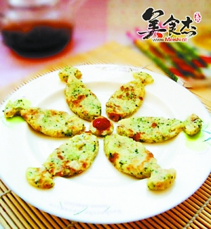 用模具将蛋饼扣成可爱的小鱼形状摆盘,再用番茄酱点缀即可