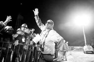 当地时间午夜刚过,阿瓦洛斯成功升井后从救生舱走出,戴着头盔和保护眼睛免受亮光损伤的太阳镜。现场爆发出热烈掌声和欢呼声,人们高喊国名“智利!”