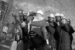 营救行动伊始,智利总统皮涅拉一直守在现场。他与每名升井矿工拥抱,向下井救援人员祝福。