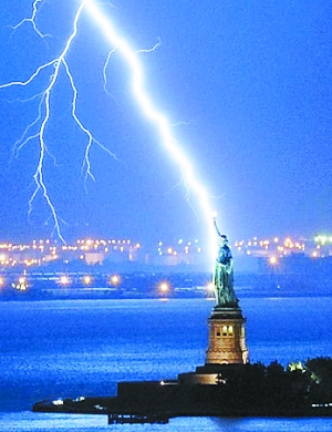 9月22日晚上8时45分,美国摄影师杰·费恩拍摄到闪电直接打在自由女神像上的惊人照片,据悉他为了拍摄这一幕已经等候了40多年。美国自由女神像是法国在1876年赠送给美国独立100周年的礼物,1886年建成,整座铜像以钢铁为骨架,总重225吨,连基座高约93米。据信它每年大约要受到600次雷击。