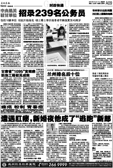 客户热线:0931-96555 传真:0931-8159628(新闻) 8123740(广告) 本报社址:兰州市白银路123号 邮编730030 Email:lzcbreader@163.com