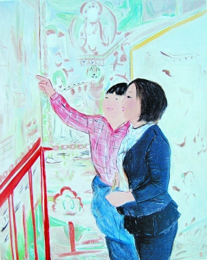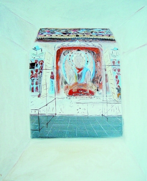 高尔泰先生的临摹品中最为精彩的是残破墙壁的裂缝和裂缝的描绘,这部分可用超写实主义来形容,精致、逼真的甚至对着印刷品就想去摸它。陈列中心复制的217窟的东壁是高尔泰临摹的,敦煌研究院美术研究所副所长马强指着下端的一小块儿墙皮说:“这块墙皮好像退进去了,旁边的画出来了,而且还没有笔触,很妙。”