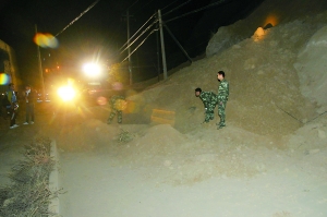 本报讯(记者郑志成)10月19日晚9时10分,位于城关区大砂坪城市建设学校西200米处发生山体滑坡事故。约8米宽的路面被滑土覆盖,盐场路派出所民警和盐场消防中队官兵立即赶到现场进行清理。据初步判断,该路段进出学生虽然较多,但因尚未下晚自习,暂无人员伤亡报告。
