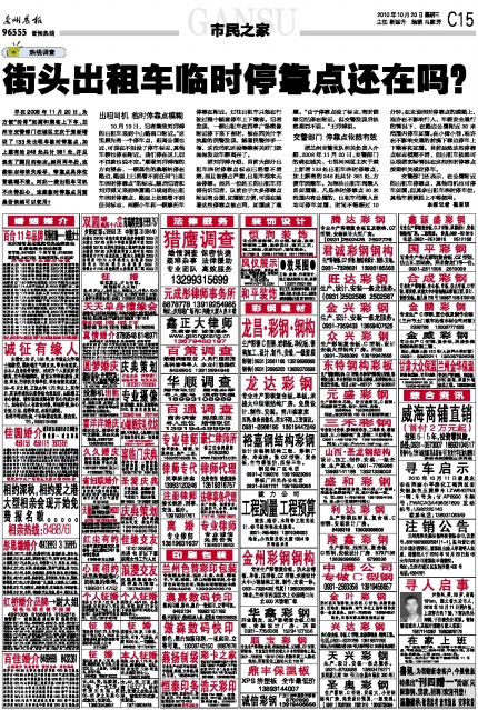 客户热线:0931-96555 传真:0931-8159628(新闻) 8123740(广告) 本报社址:兰州市白银路123号 邮编730030 Email:lzcbreader@163.com