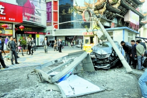 当日上午9时许记者在现场看到,一根电线杆被拦腰撞断,电线杆上方部分压在小轿车上,小轿车面目全非,而公用电话亭则被撞倒在地。记者从东岗交警大队了解到,当日凌晨5时许,值班民警赶往现场进行了处理。