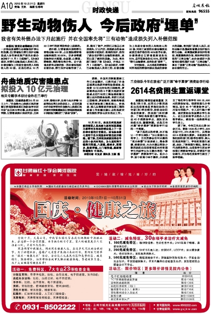 客户热线:0931-96555 传真:0931-8159628(新闻) 8123740(广告) 本报社址:兰州市白银路123号 邮编730030 Email:lzcbreader@163.com