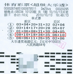 10月13日,马老汉买了5注10120期大乐透随机号,第二天一早他按照老习惯到站点看前一日的开奖号码,见到大红喜报和横幅他便知道了中大奖的事,当看到10120期的中奖号码“08、10、18、34、35+06、10”正在自己所购买的彩票上时,马老汉赶紧把彩票往口袋里一揣,抬脚就往家跑。回到家后马老汉还不太放心,怕是自己眼花看错了,于是把彩票藏在了枕头套里,自己又带上纸笔去站点把中奖号码抄了回来。结果不言而喻,当期江苏省中出的唯一一注602万元的头奖就是被马老汉给擒获了。