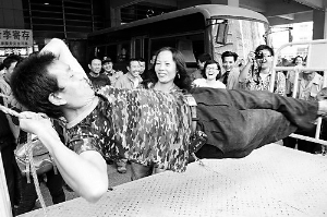 本报讯 据人民网消息,看过电视剧《神雕侠侣》的人都知道,小龙女有个绝技,就是睡在绳子上,这让杨过艳羡不已。在杭州的城站火车站,也潜伏着这么一位“武林高手”,他可以躺在一根麻绳上小憩。据悉, “睡绳哥”今年38岁,贵州毕节人,以前在老家的搬家公司干活,4个月前才到杭州做搬运工。据他介绍,自己从小在农村长大,无聊的时候就在两棵树之间系根绳子,躺在上面睡觉。
