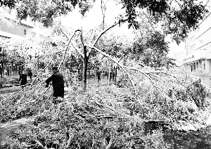 10月24日上午7时,家住酒泉市老城区盘旋中路15号家属院的张大姐出门做生意时,眼前的情景让她惊呆了:住宅区内一条东西走向的马路两旁,30多棵碗口粗的槐树,竟有12棵不同程度折损。