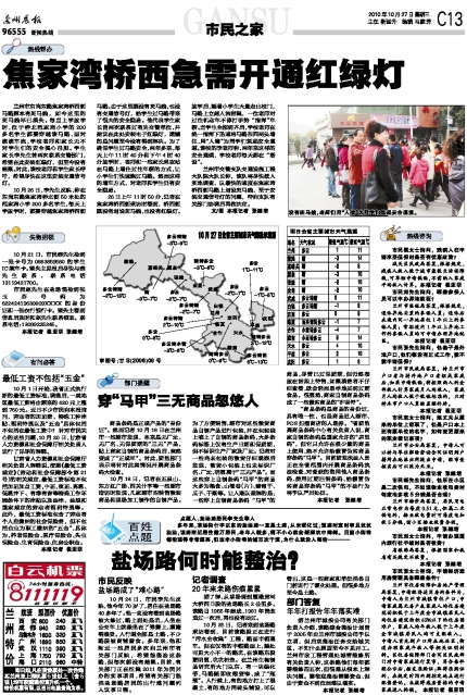客户热线:0931-96555 传真:0931-8159628(新闻) 8123740(广告) 本报社址:兰州市白银路123号 邮编730030 Email:lzcbreader@163.com