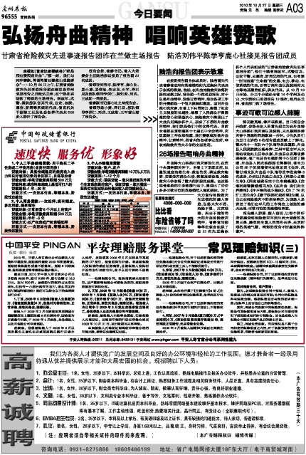 客户热线:0931-96555 传真:0931-8159628(新闻) 8123740(广告) 本报社址:兰州市白银路123号 邮编730030 Email:lzcbreader@163.com