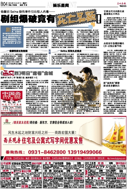 客户热线:0931-96555 传真:0931-8159628(新闻) 8123740(广告) 本报社址:兰州市白银路123号 邮编730030 Email:lzcbreader@163.com