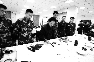 10月28日下午,中国画院兰州分院的二十余位艺术家来到武警甘肃省总队第三支队,将200幅书画作品送到武警官兵的手中以表慰问。各位艺术家还现场挥毫泼墨,为全体官兵表演书画绝技。