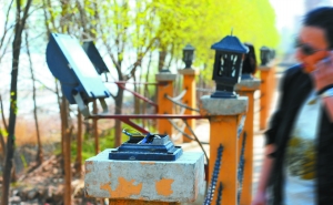 4月8日,记者看到水车博览园的水车旁大量的景观灯被人破坏,灯罩与基座上的螺丝全被人卸走,里面多根电线被剪断,部分电子元件不知去向,让人痛心。