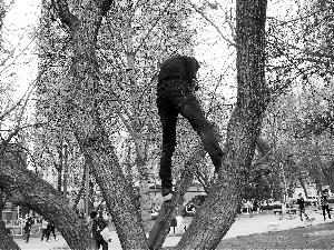 4月8日,记者在兰州水车园门口的树林里看到,一男子为给人拍照竟爬上绿化树踩在树干上,这种行为既不安全又不雅观,也使大树承受“无辜之痛”。爱护身边的绿色,就是爱护我们的生活,请珍惜您身边的花草树木。 本报记者 窦阳 摄