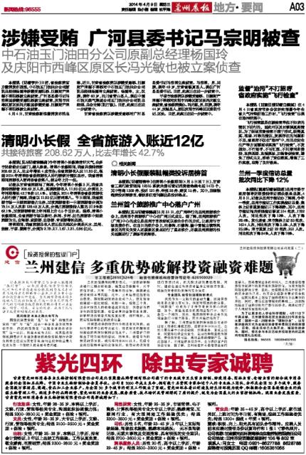 客户热线:0931-96555 传真:0931-8159628(新闻) 8123740(广告) 本报社址:兰州市白银路123号 邮编730030 Email:lzcbreader@163.com